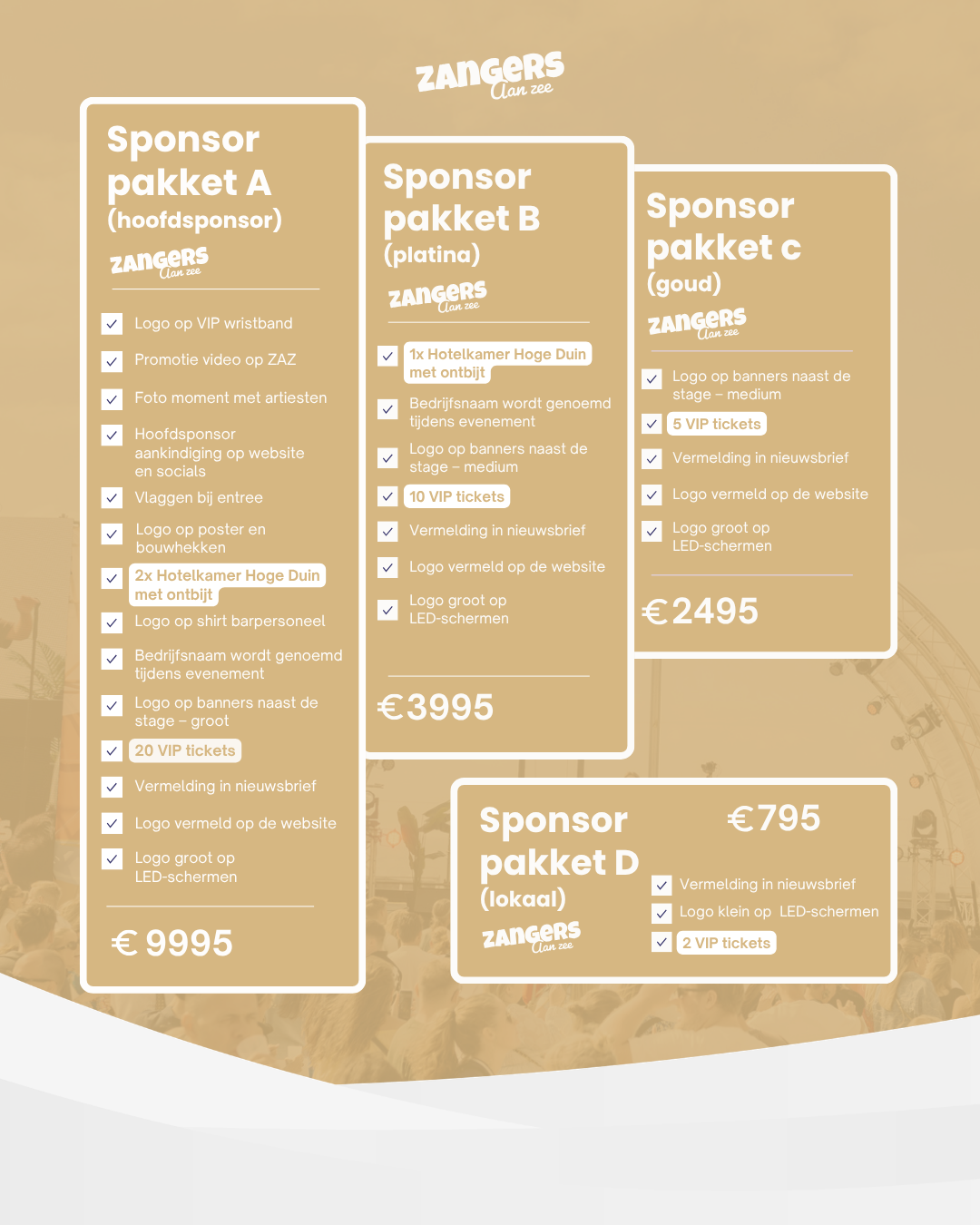 Zangers aan Zee biedt verschillende VIP-arrangementen aan. De inhoud, prijzen en beschikbaarheid van deze arrangementen zijn te vinden op de website onder het kopje ‘Arrangementen’.
